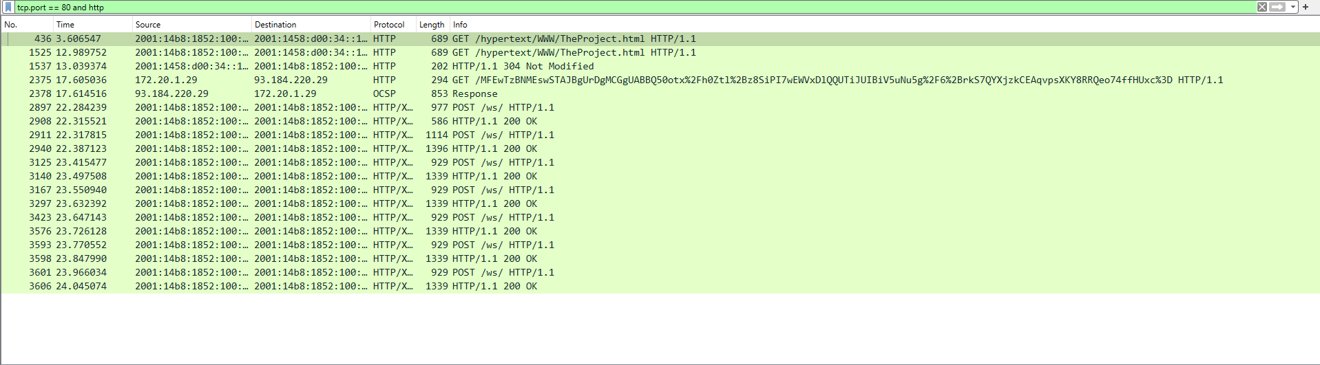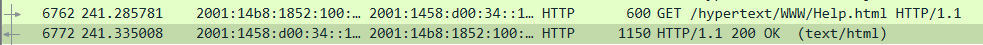 Jos lataamme sivun, näämme liikenteen Wiresharkissa: