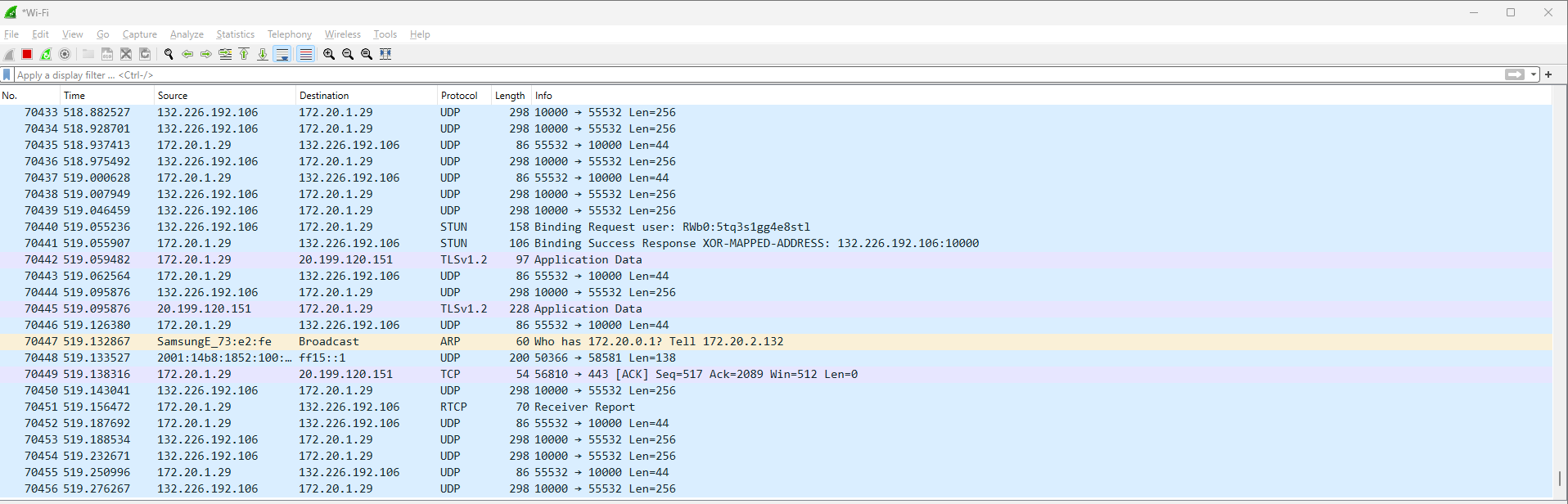 Liikenne on täynnä UDP-paketteja, joiden uskoisin olevan päällä olevan Jitsi-puhelun takia.