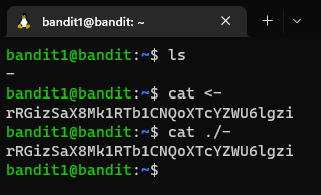 Tällä kertaa salasana on tiedostossa, joka on nimetty “-“. Tämä on kuitenkin Bashissa merkki, joten suora cat - ei toimi. Tiedosto voidaan kuitenkin lukea ohjaamalla sen sisältö stdout:iin tai viittaamalla juuri tähän tiedostoon käyttämällä ./- komentoa: