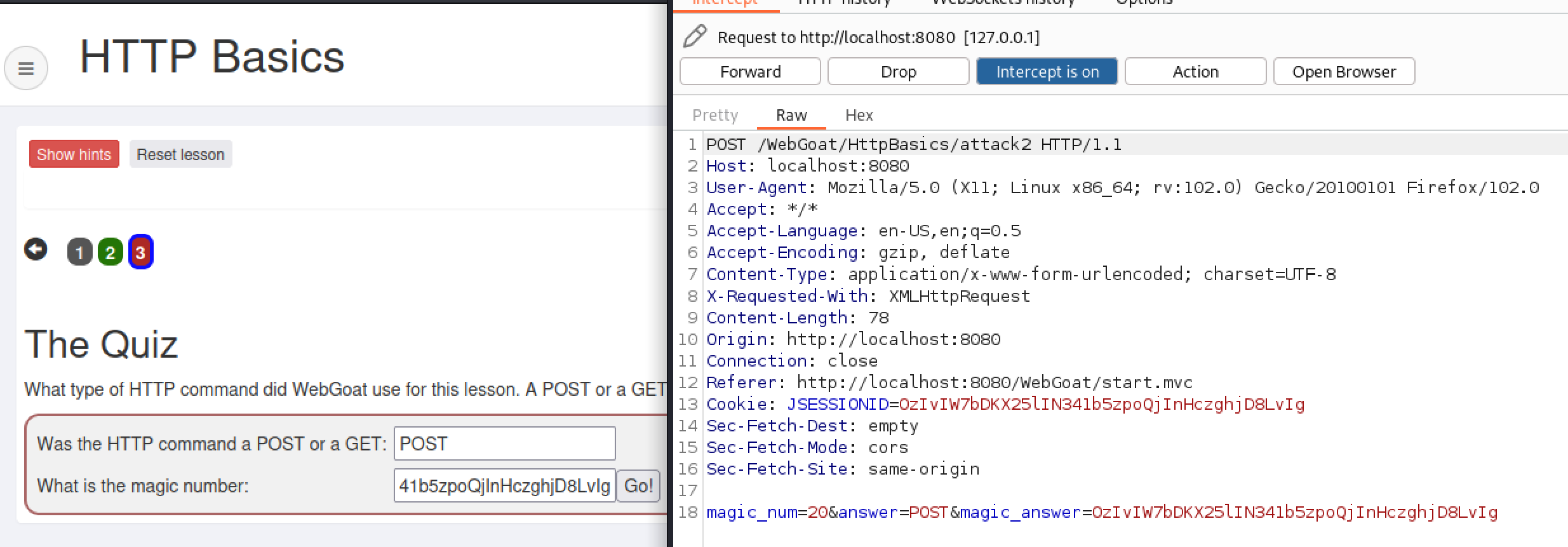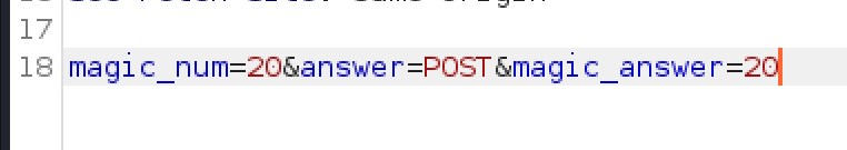Syötin salaiseksi numeroksi Cookieni, sillä tiesin että muokkaan POST-komentoa ennen kuin sen lähetän. Ja kuten näemme, selain lisää itse POST-komentoon magic_num-kohdan, joka on 20.