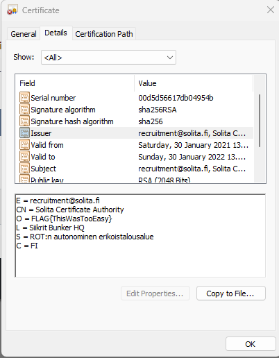 Tehtävä antaa ladattavaksi crt-tiedoston, jota tutkimalla löydämme Issuer-tiedoista lipun.