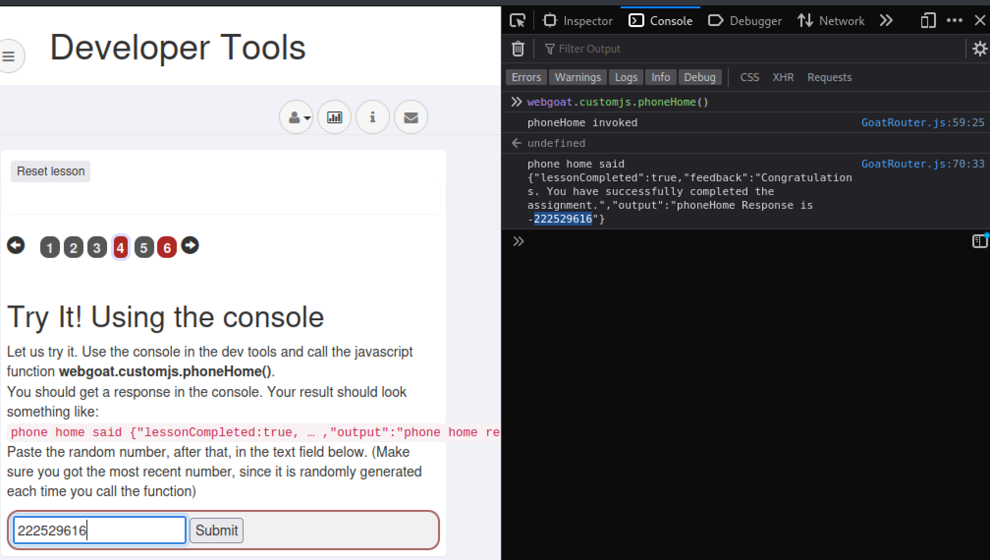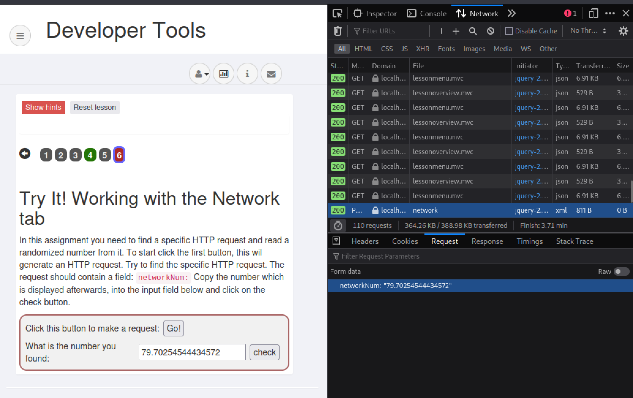 Lopuksi vielä lähetämme pyynnön serverille painamalla painiketta, ja tutkimme tuota pyyntöä kehittäjätyökaluilla “Network”-tabissa. Täältä löydämme oikean vastauksen viimeiseen tehtävään.