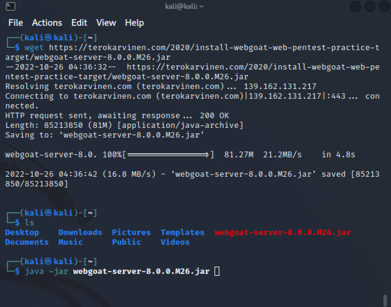 Tämän jälkeen asennetaan webgoat ajamalla wget-komento, ja sen jälkeen käynnistämällä webgoat Javalla.