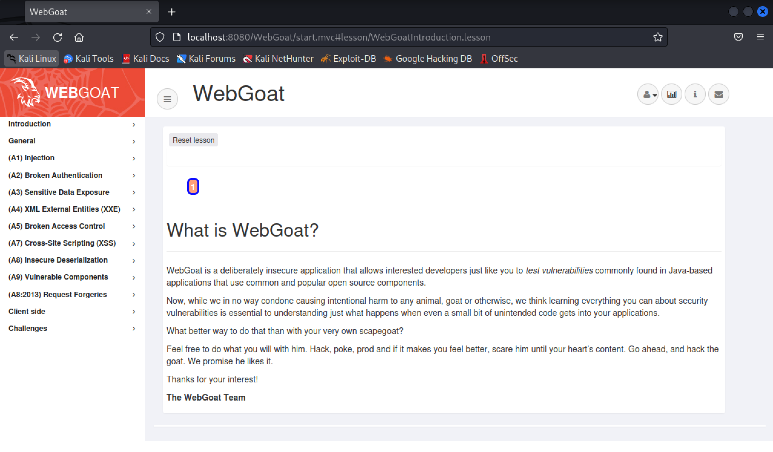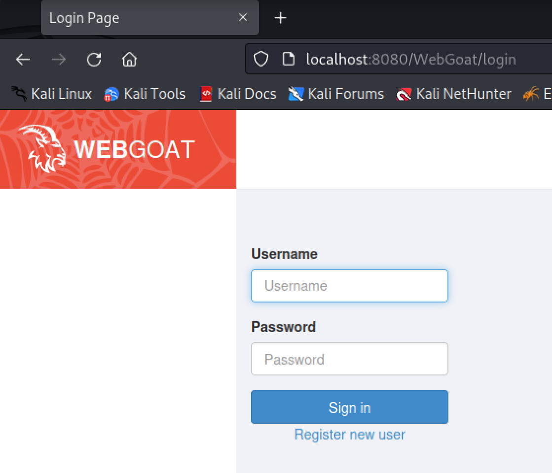 Nyt voimme avata selaimesta webgoatin, joka pyörii paikallisella laitteella portissa 8080.