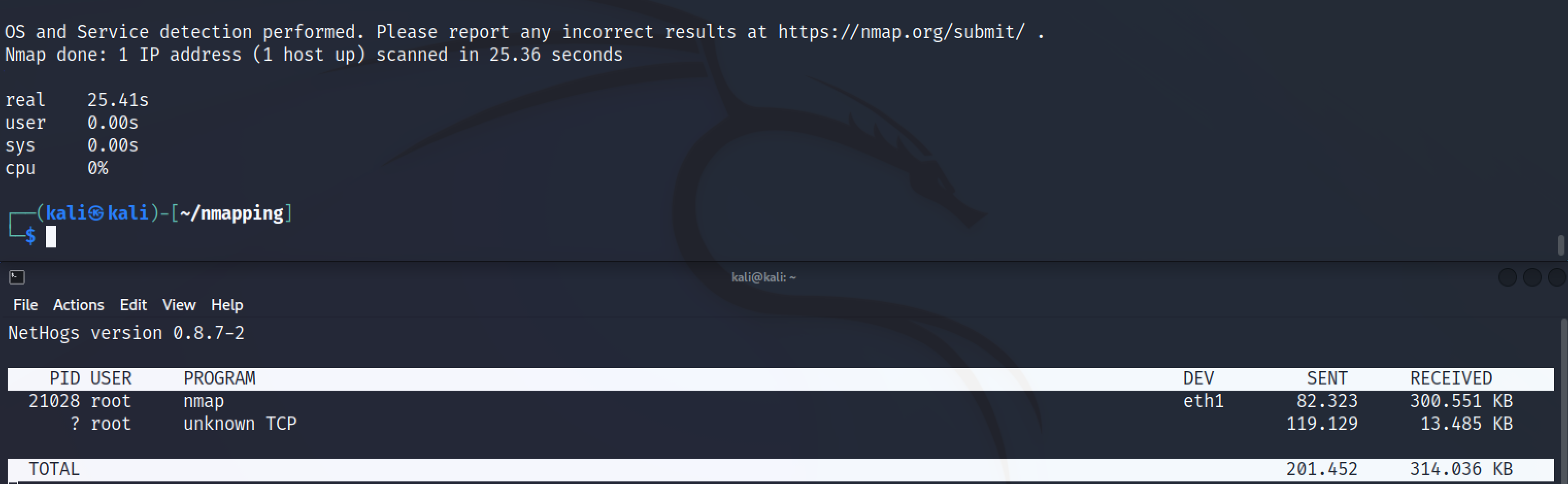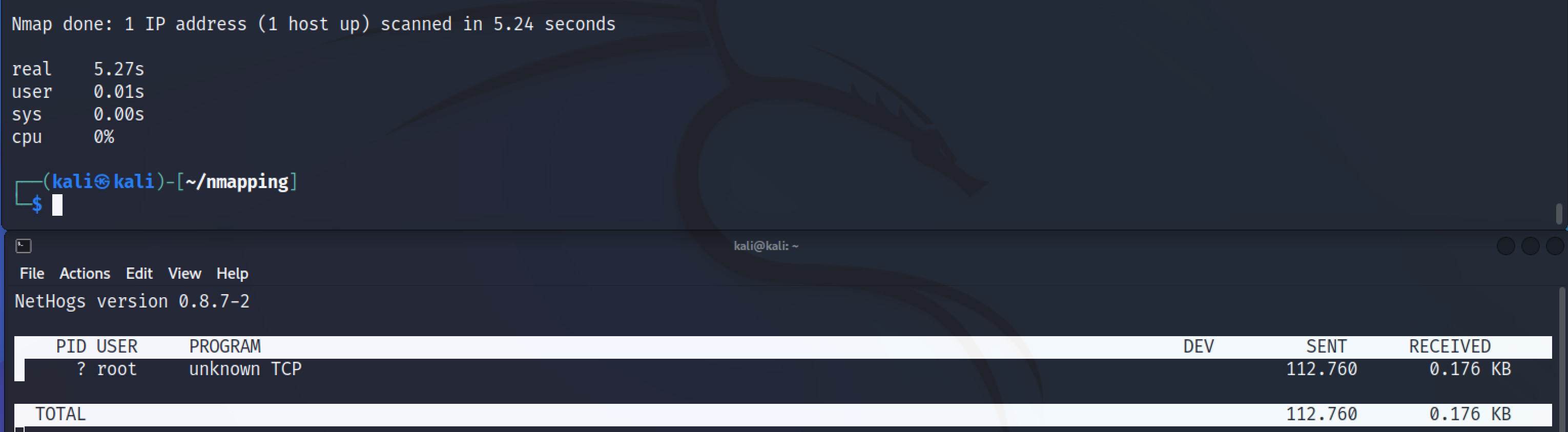 Vertaillaan, kuinka paljon -A flag vaikuttaa skannin ajon nopeuteen ja lähetetyn liikenteen määrään. Nopeutta voidaan tutkia ajamalla “time”-komento. Lähetetyn liikenteen määrää tutkin puolestaan vinkeistä löytyneellä nethogs-ohjelmalla.
