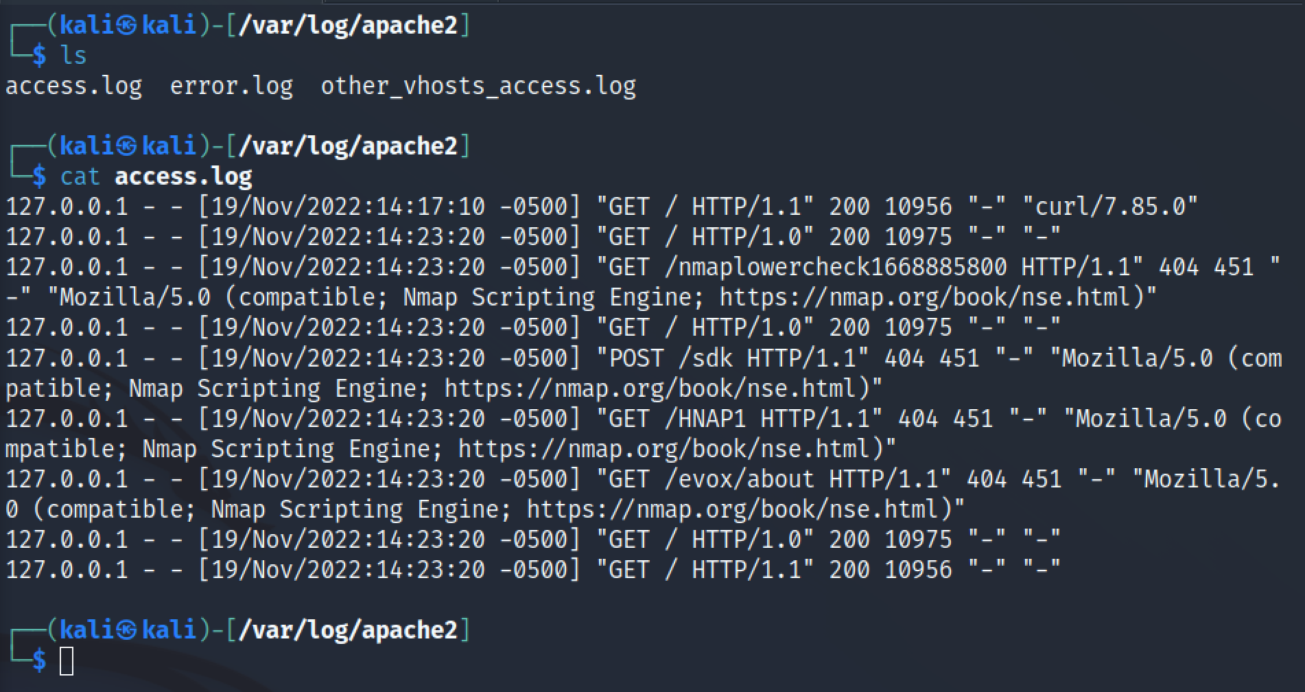Voimme seuraavaksi tutkia apachen logitiedostoja, jotka löytyvät linuxissa polusta /var/log/apache2/.