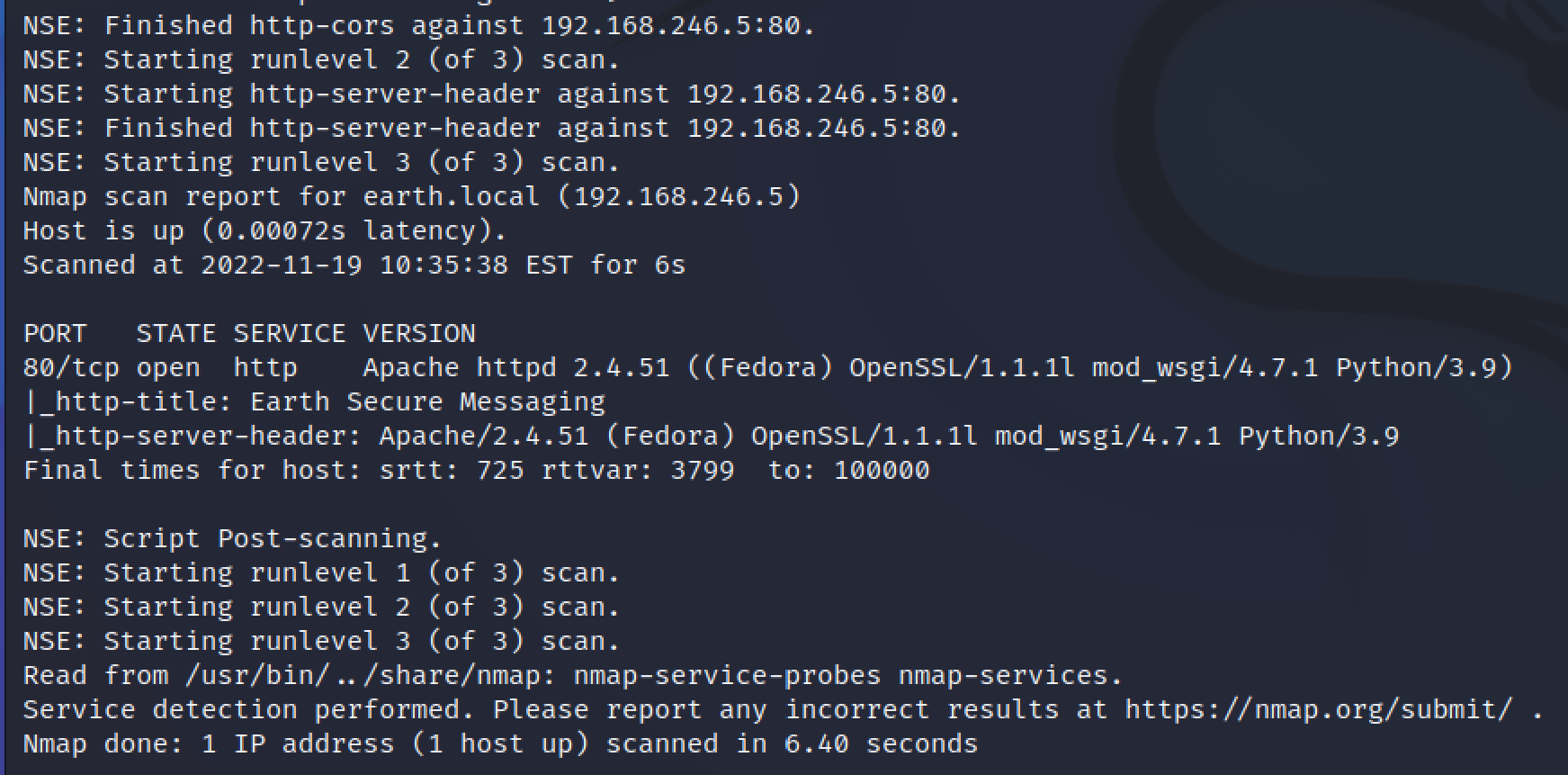 Näemme myös, kuinka versiotunnistus tuntuisi toimivan niin, että nmap pyytää palvelimelta muutaman sivun, jonka tietää johtavan 404-virheeseen. Tämä on siksi, että Apachen oletussivu 404-virheessä sisältää palvelimen versionumeron.