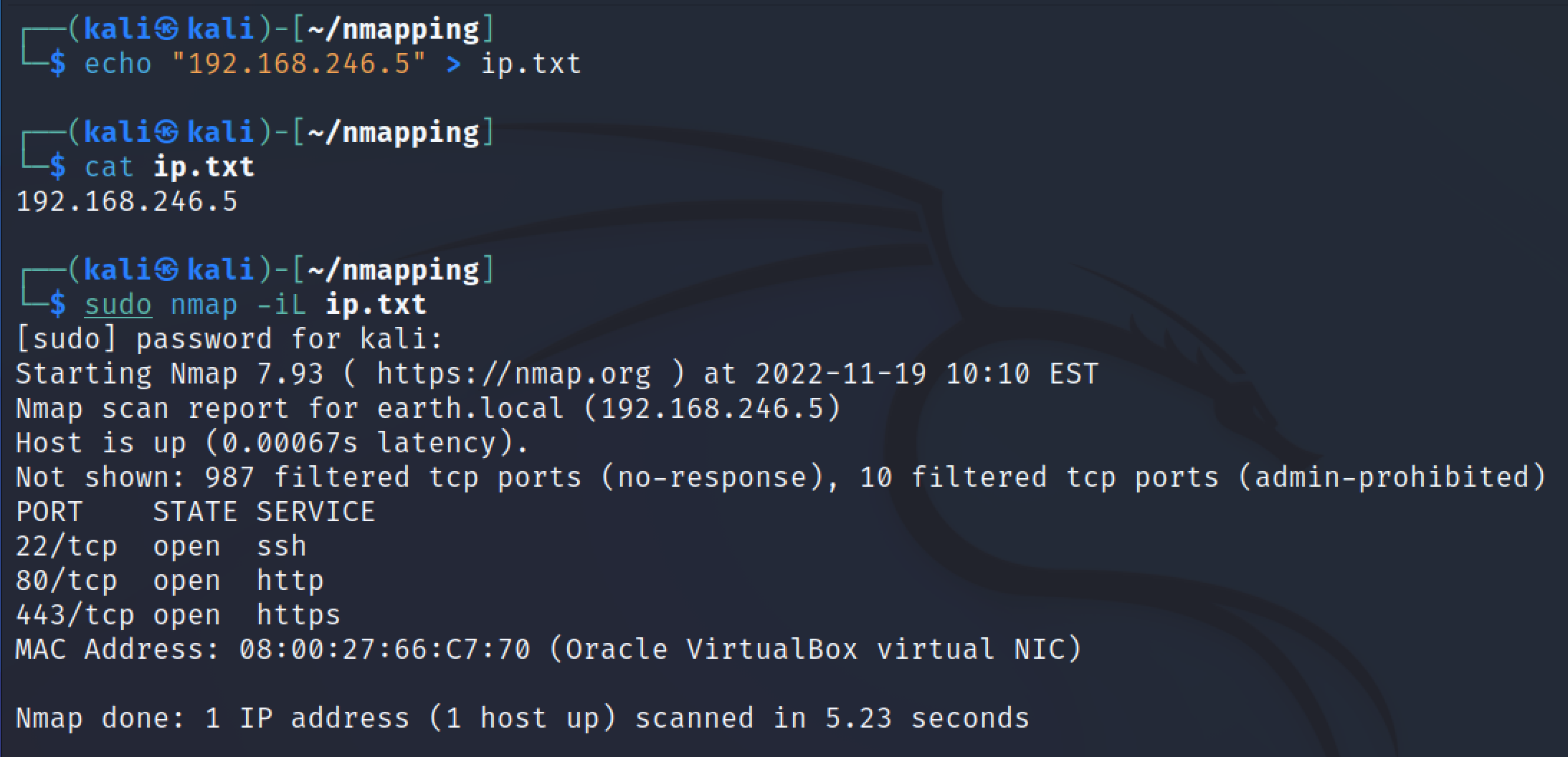 -.gnmap - Tämä on samanlainen kuin normaali .nmap tiedosto, mutta se tallentaa yhden kohteen tulokset aina yhteen riviin. Tämä on siksi, että jos skannataan useita kohteita, tästä tiedostosta on helpompi hakea tuloksia mm. grep komennolla. Siitä tuleekin tiedoston nimi gnmap, tarkoittaen “greppable nmap”.
