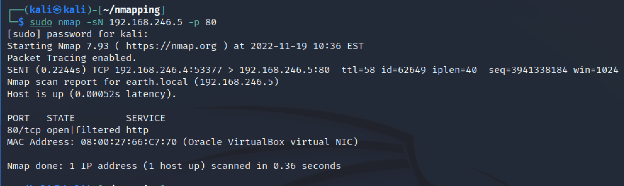 -Pn eli “don’t ping” flag saa nmapin aloittamaan porttiskannauksen ilman pingausta. Ilman flagia nmap lähettää ensin yhden paketin kohteeseen varmistamaan, että se on verkossa, ennen kuin porttiskannaus aloitetaan. Kuitenkin tällä flagilla, tämä voidaan ohittaa. Tämä on hyödyllistä, jos skannataan vain yhtä kohdetta, jonka tiedetään jo olevan verkossa.