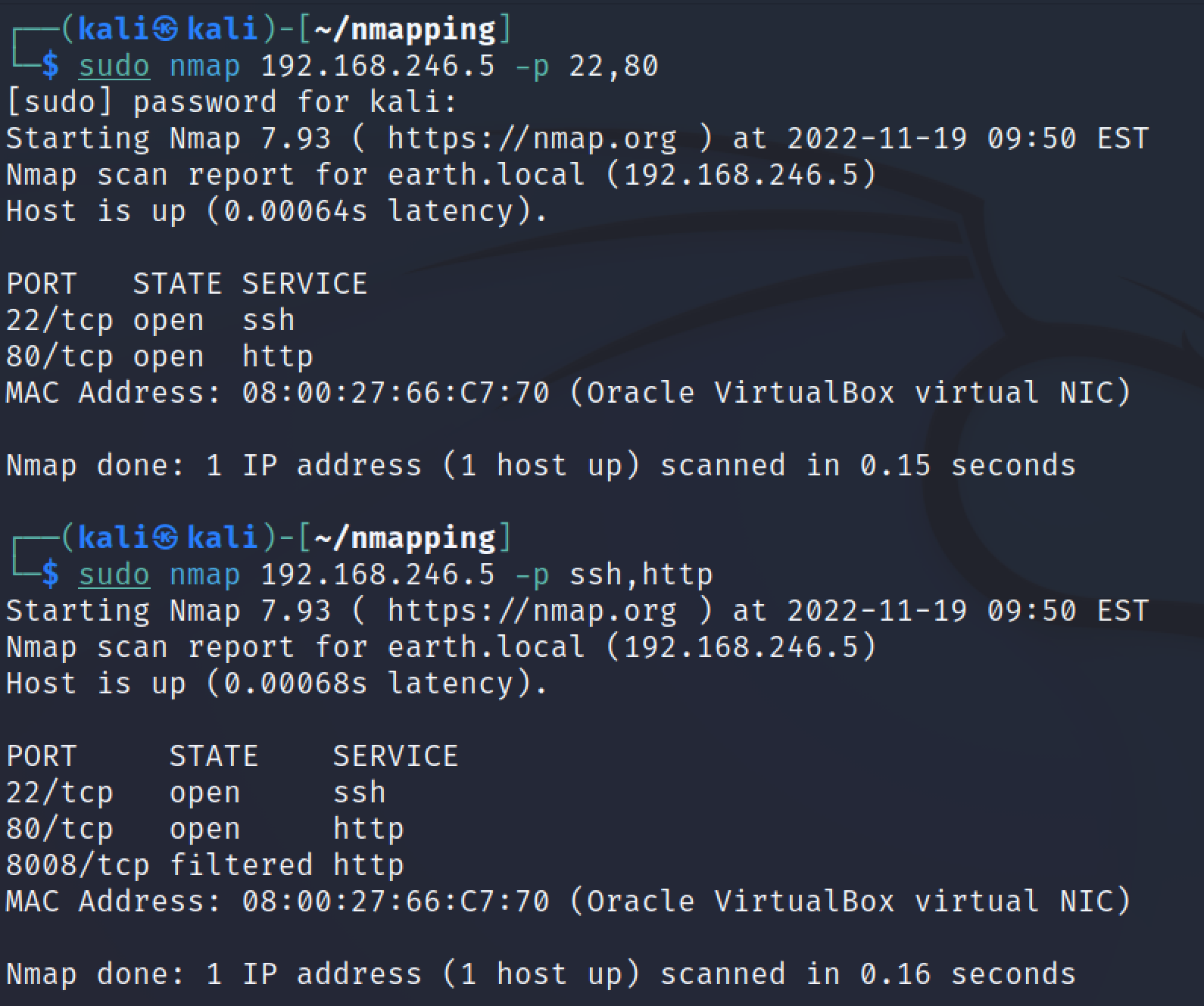 Tässä nmap valitsee samat portit, vaikka syntaksi on eri.