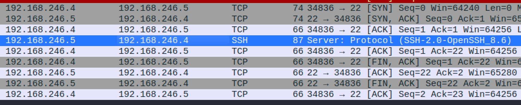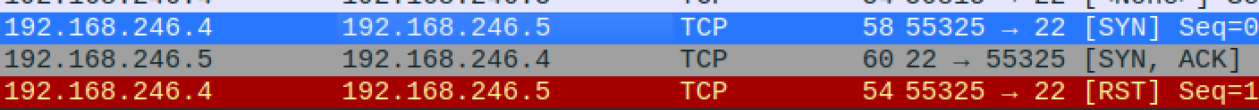 Tässä näemme, miten nmap (.4) ja kohde (.5) porttiin 22 (SSH) käyvät läpi normaalin TCP kättelyn (SYN => SYN/ACK => ACK => RST)