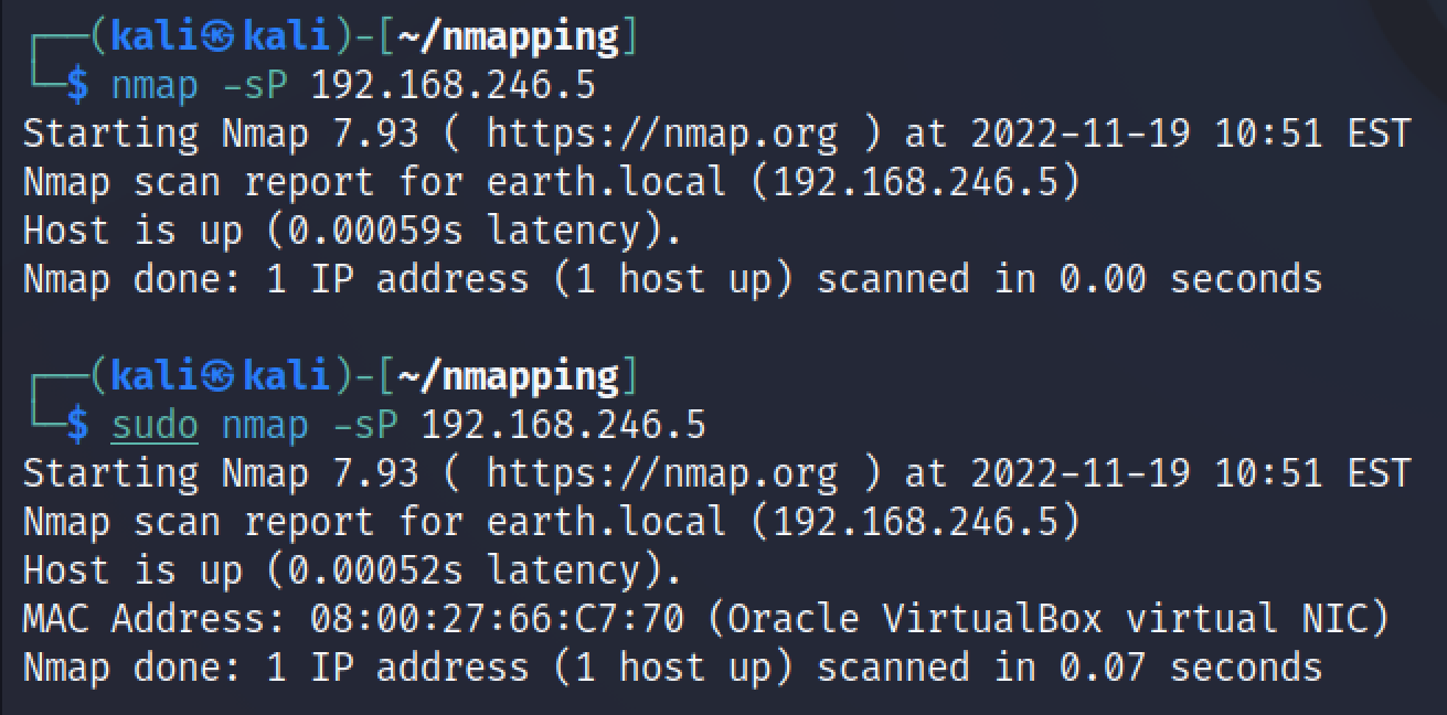 Esimerkiksi ping sweep skannaus ilman sudo-oikeuksia ei kerro kohteen mac-osoitetta, toisin kuin sudo-oikeuksilla.