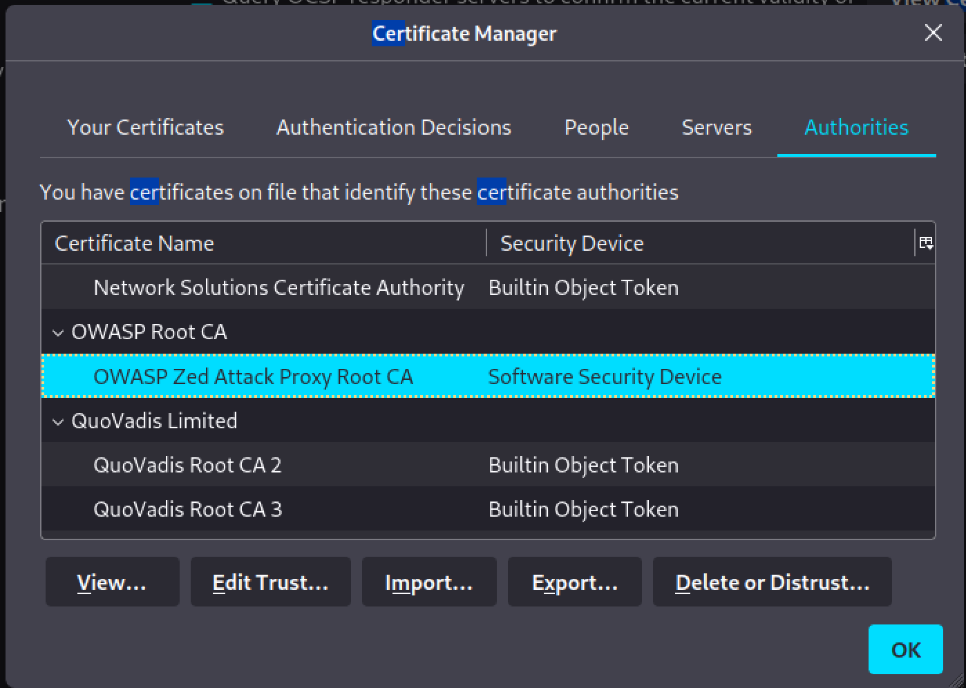 Tämä sertifikaatti voidaan tallentaa ZAP:in asetuksista Network-kohdasta:
