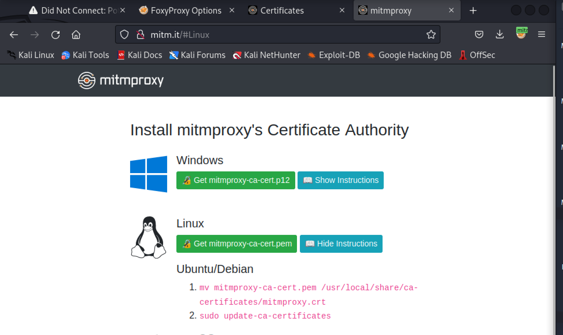 Mitmproxy tarjoaa hyvät ohjeet SSL-sertifikaatin asentamiseen, kun navigoi proxy päällä osoitteeseen http://mitm.it. Tämä sivu tarjoaa ohjeet sertifikaatin asentamiseen eri selaimille ja käyttöjärjestelmille. Omassa tapauksessani asensin sertifikaatin Firefoxin asetuksista, kuten ZAP:in tapauksessa.