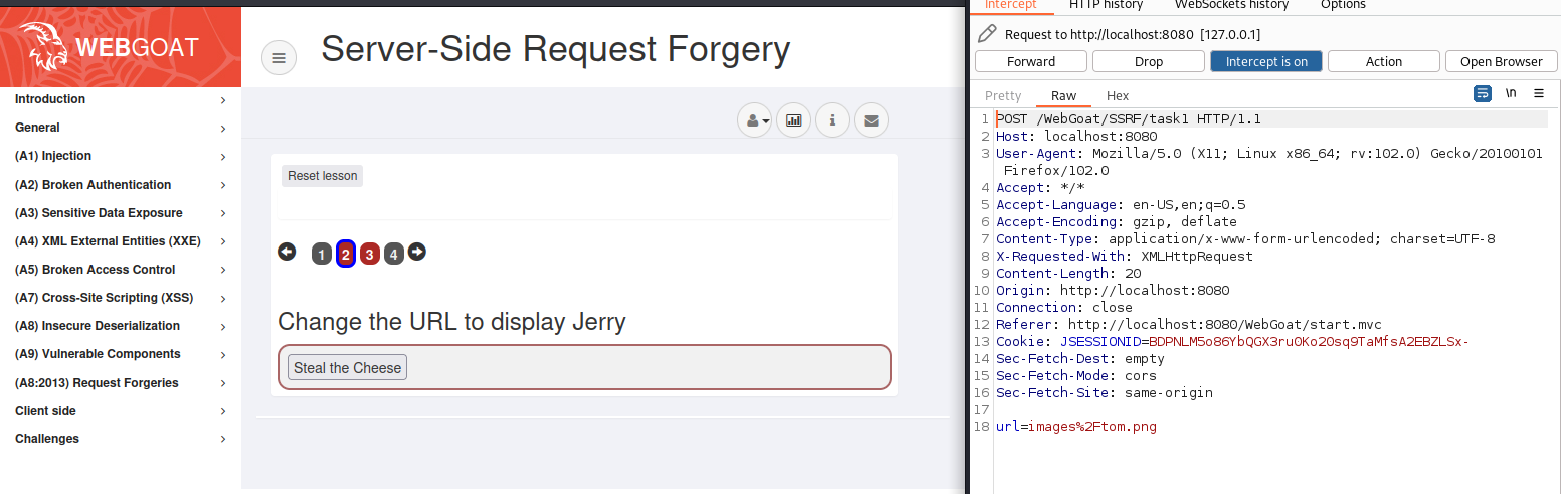 Ratkaistaan SSRF-tehtävä WebGoatista käyttäen apuna Burpsuite proxya.