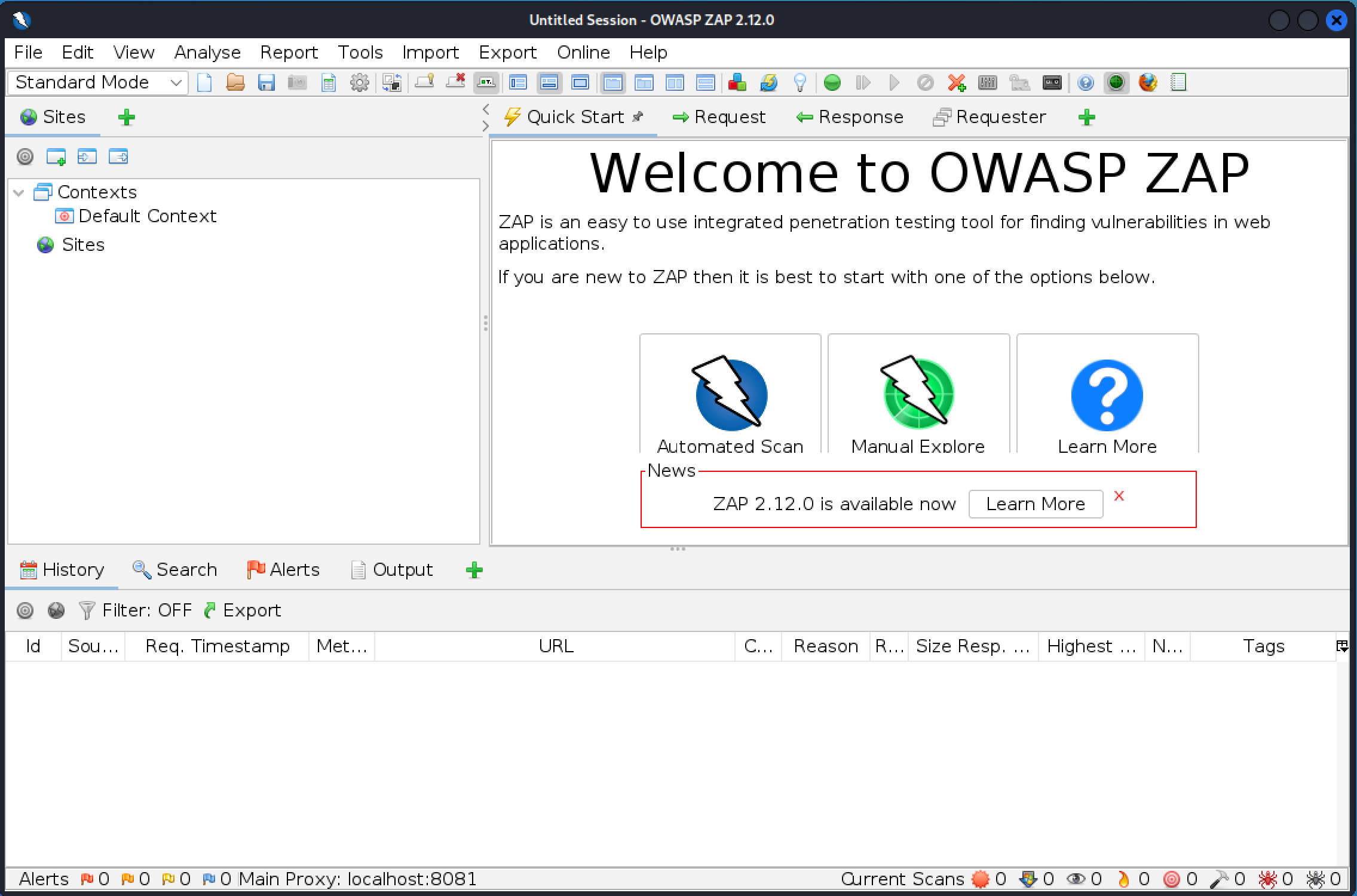 Ohjelman alapalkista näemme, että proxy on auki localhost-osoitteessa portissa 8081. Voimme nyt avata selaimemme ja ohjata liikenteen tämän proxyn läpi, että ZAP voi muokata sitä.